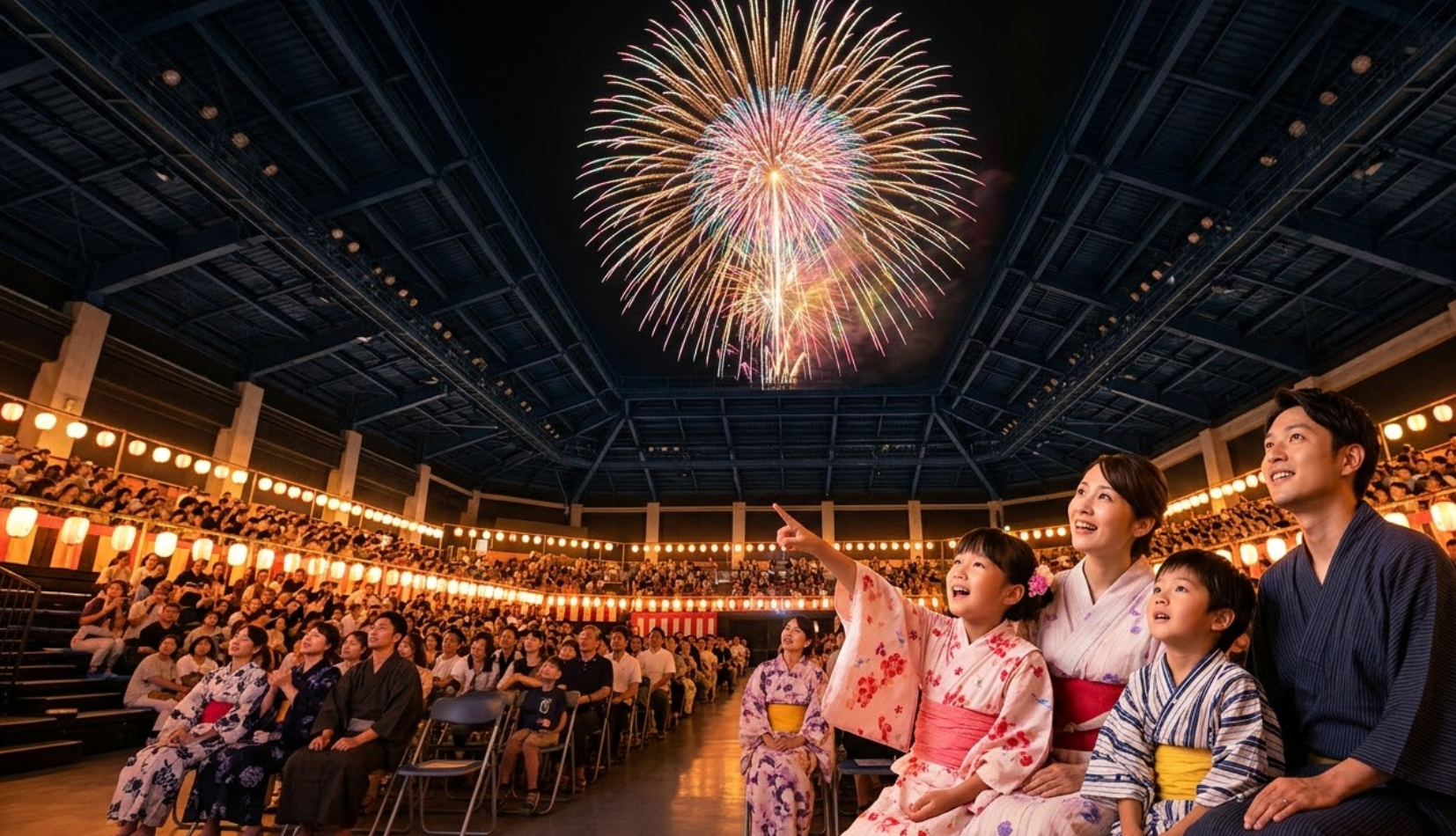 施設内の特設会場で、本格的な打ち上げ花火や仕掛け花火を間近で鑑賞する夏の夜のイベント。