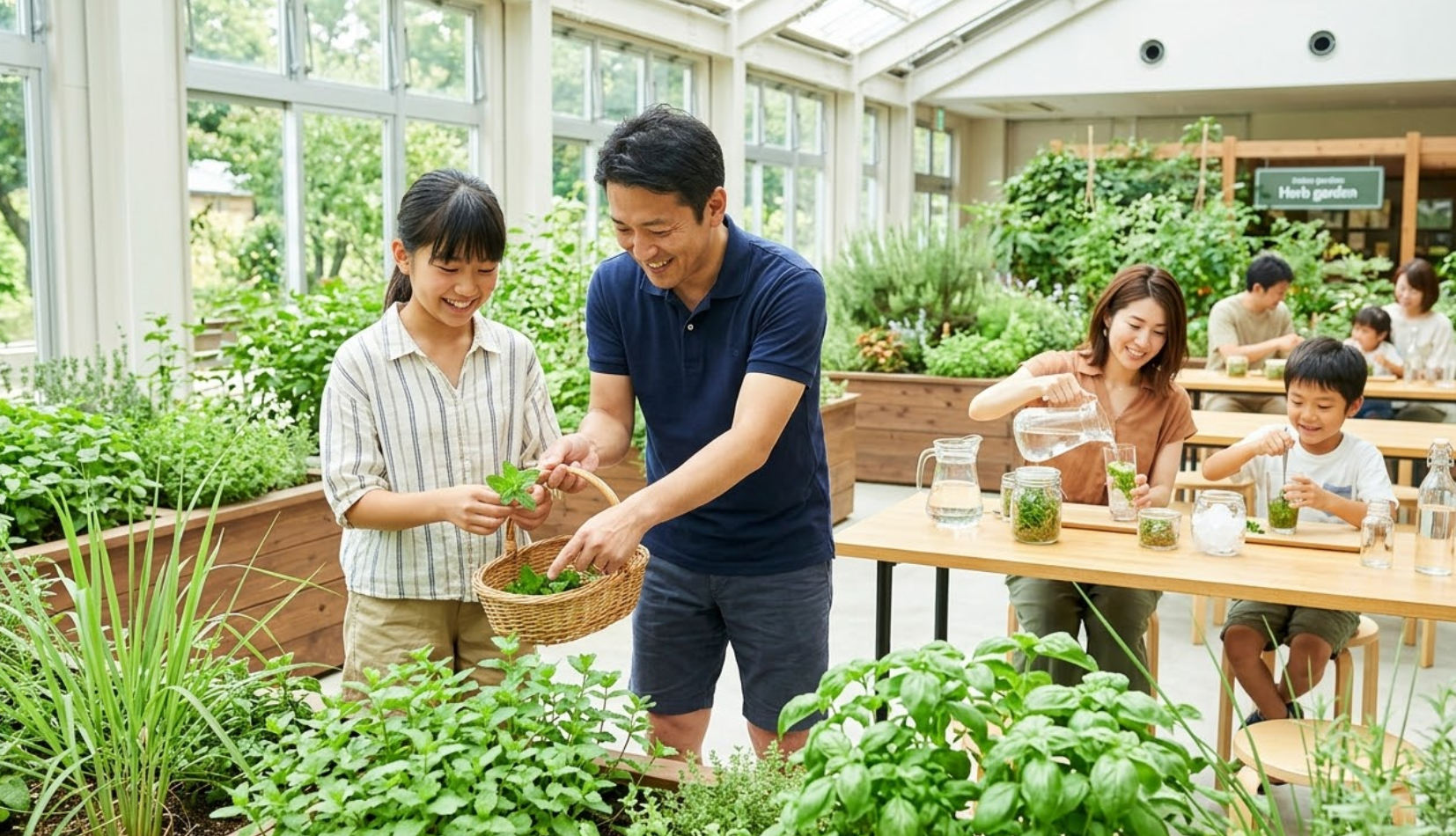 施設内のハーブガーデンでミントやレモングラスを収穫し、爽やかな冷たいドリンクを作る。