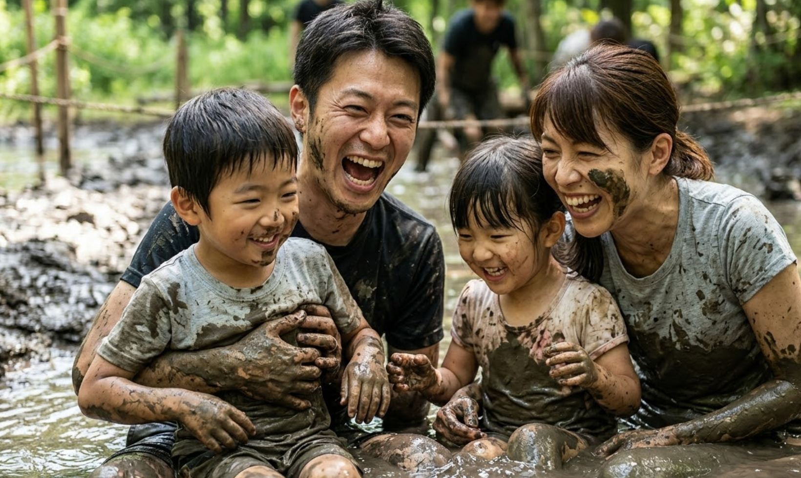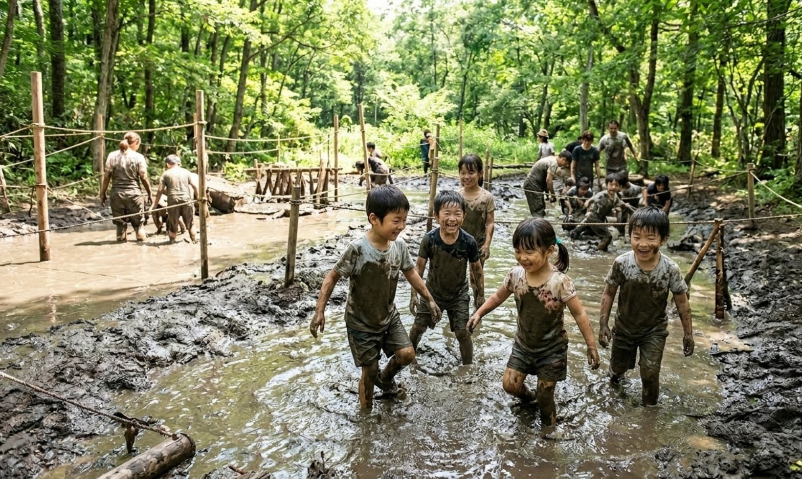 泥水が張られた特設エリアで、泥まみれになりながら障害物競争や宝探しを楽しむ。