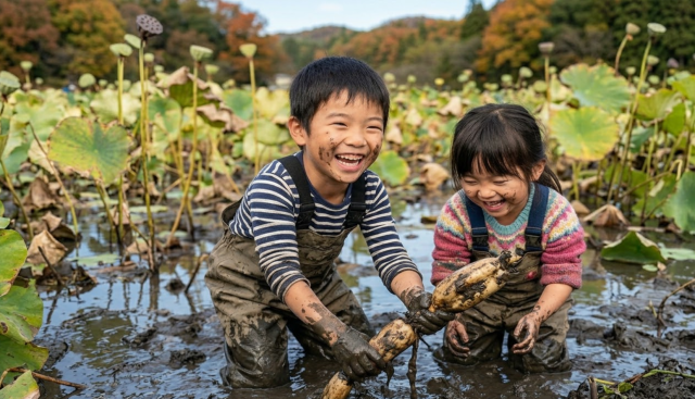 泥んこになってレンコンを掘り出す!お宝探しのような大冒険