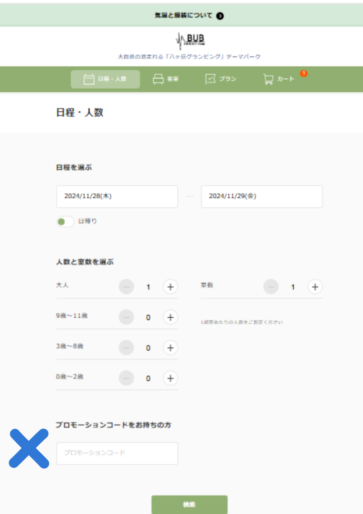 ※最初の予約画面に「プロモーションコード」記入欄がありますが、こちらに入力してもクーポンとして反映されませんので、ご注意ください。