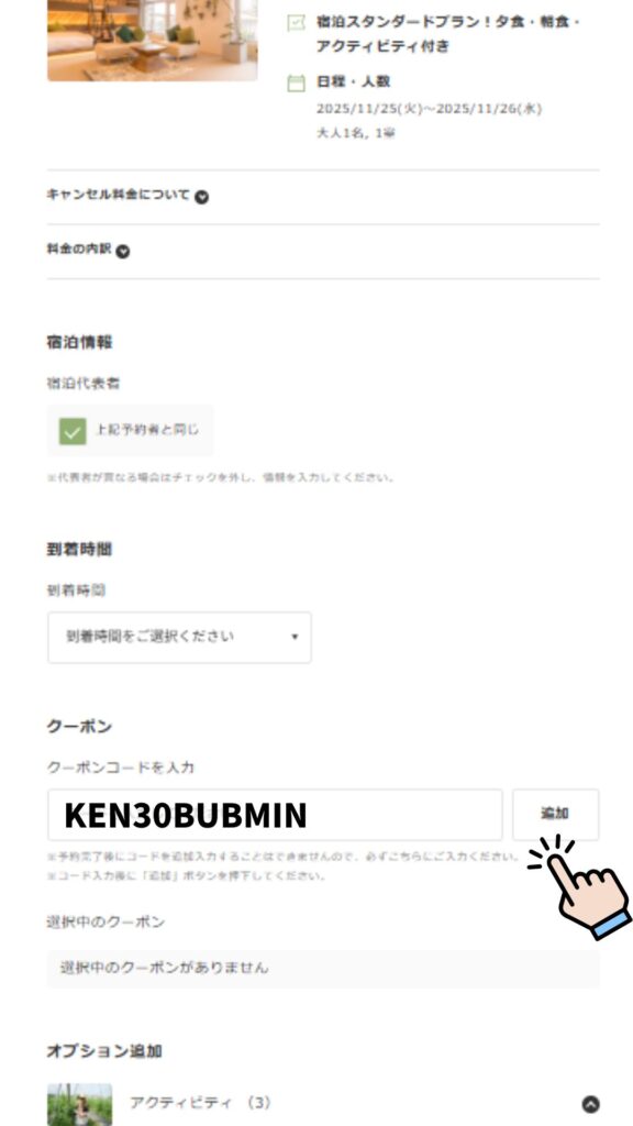 「予約情報入力画面」にてクーポンコード【KEN30BUBMIN】を入力