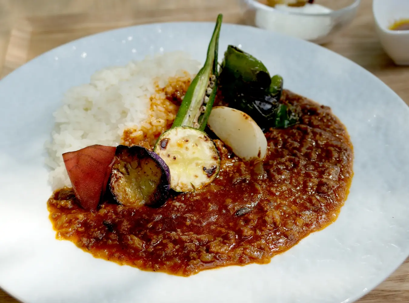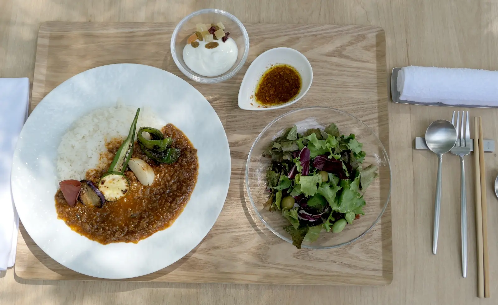 森の静けさと小鳥のさえずりが、ひと口ごとのカレーをより深い味わいに。 新鮮な地元野菜と、特製スパイスをブレンドしたカレーは、ここでしか出会えない一皿です。